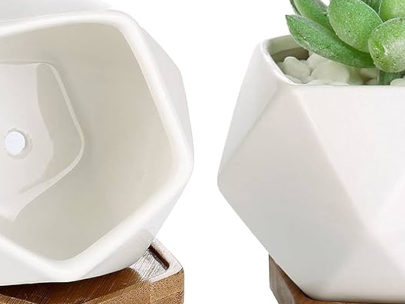 Macetas pequeñas de cemento con patrones geométricos modernos.