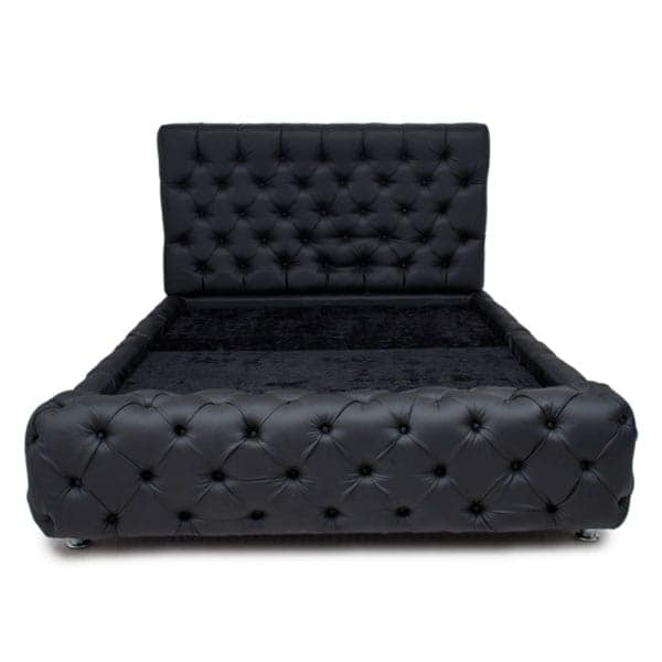Cama tapizada de color negro, con base de madera.