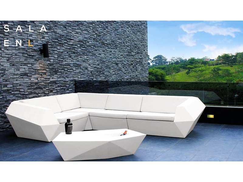 Sala en L 4 puestos. Fabricado con resina de poliéster. Apto para exterior e interior. Disponible en varios acabados. 100% reciclable. Acabado texturizado o liso. Acabado superficial Gel Coat Mate o Brillante. Cojines fabricados en cuero sintético para exteriores con espuma de alta densidad.