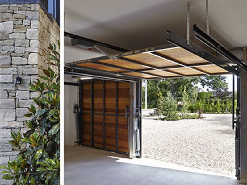 Características: Se levanta verticalmente y luego se desplaza hacia el techo. Puede ser de una o dos hojas. Requiere espacio en el techo para abrir completamente.