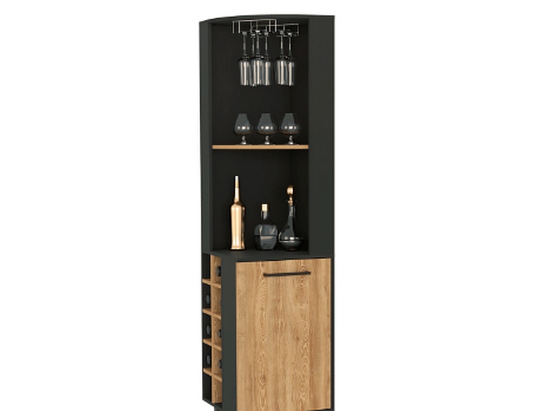 Bar Esquinero Con Espacio Para Organizar Licores, Incluye Colgador De Copas, Una Puerta Abatible, Manija Y Patas Metálicas Con Medidas De: Ancho 45 Alto 180 Profundo 45.