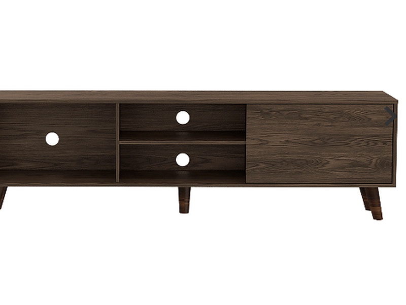 Rack para TV hecho de madera aglomerada de 15mm. Cuenta con espacio para televisor de hasta 70 pulgadas máximo, puerta abatible, espacios inferiores para colocar objetos decorativos y equipos de audio y video. Medidas: 52,5cm alto, 180cm ancho, 35cm fondo y un peso de 28,1 kg.