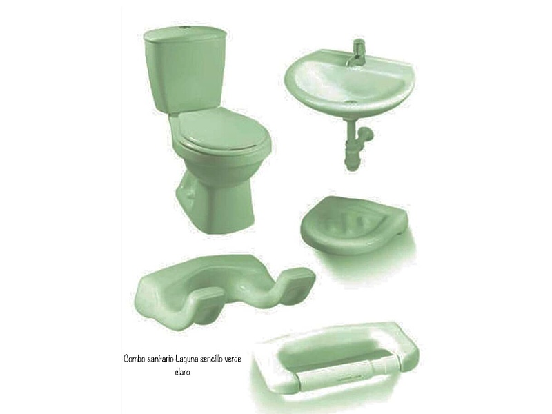 Combo Sanitario Laguna de Corona en color verde claro, ideal para espacios que desean un toque de frescura natural. Incluye un sanitario ahorrador de dos piezas, un lavamanos de colgar y grifería sencilla con jabonera, gancho y portarollo. Perfecto para crear un ambiente revitalizante y elegante.