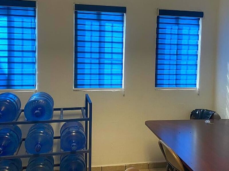 Persianas sheer elegance de color celeste para salas de estar oficinas de tamaño mediano