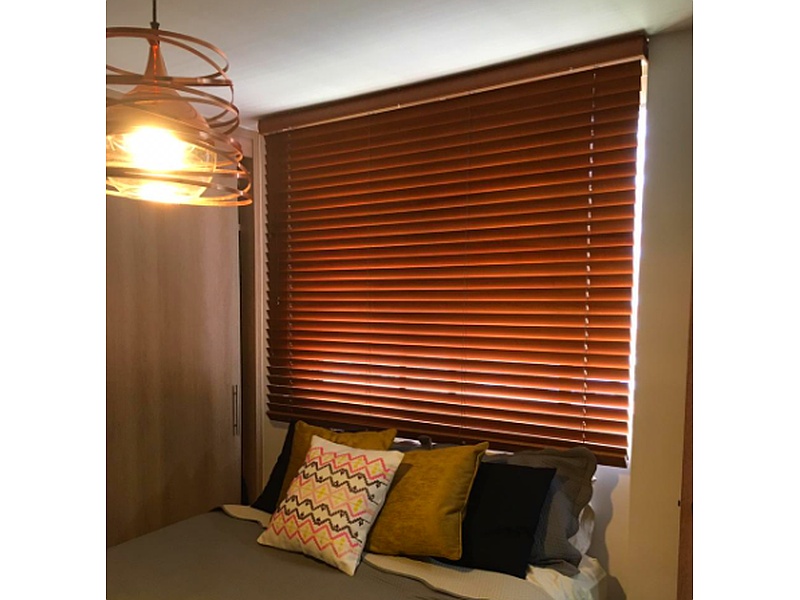 Persiana horizontal material PVC para ventanas de dormitorio en elegante color café, ideal para ventanas de tamaño mediano.