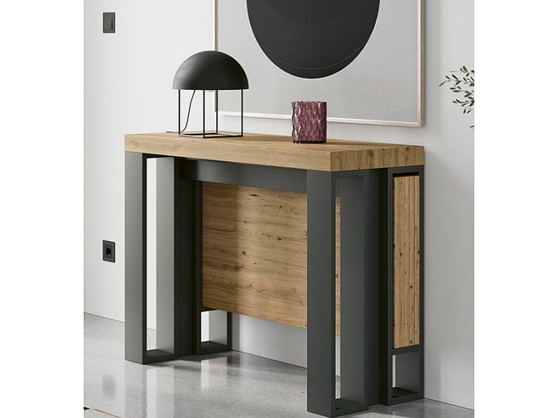 Mesa de consola estrecha y estilizada, perfecta para pasillos o entradas. Ofrece un espacio ideal para decorar con jarrones, lámparas o marcos de fotos.