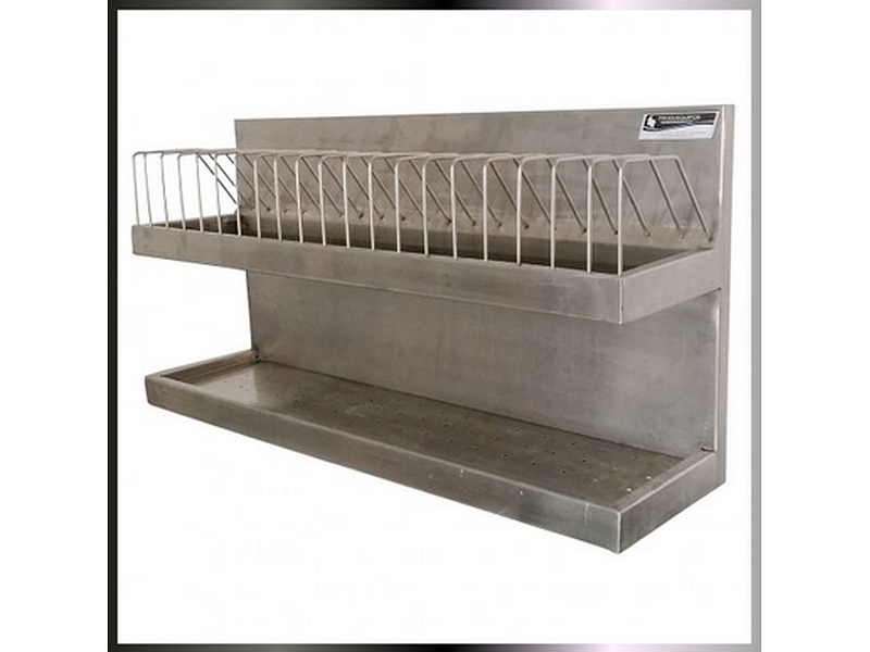El platillero cuenta con un espaldar fabricado en lámina de acero inoxidable de alta calidad, resistente a la corrosión. Dispone de niveles con varillas de acero de 3/16" diseñados para acomodar platos grandes, medianos y pequeños. Además, incluye niveles adicionales específicamente para vasos. Este diseño garantiza durabilidad y organización eficiente en la cocina. Su construcción robusta y materiales de primera aseguran un uso prolongado y confiable.