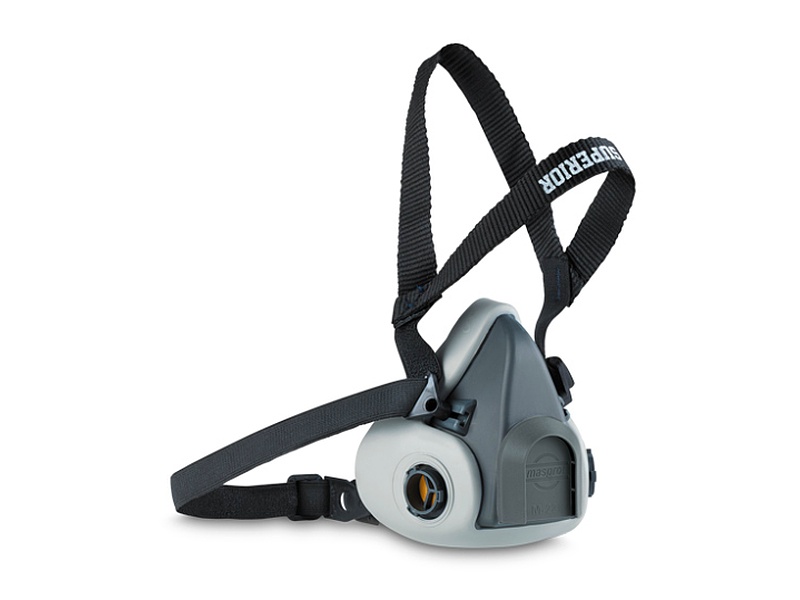 Respirador con filtros desplazados que permiten una mejor distribución del peso agregando mayor comodidad al usuario.