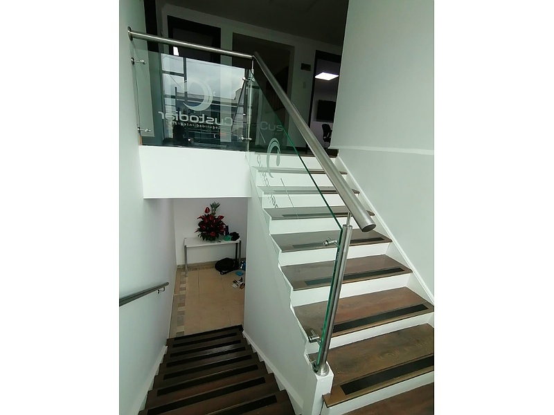 Pasamanos en Aluminio y Vidrio Templado para escalera de oficinas.