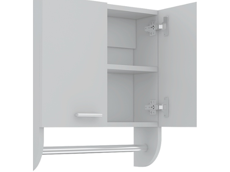 Gabinete de Baño, con 2 entrepaños, tubo y manija metálicas. Elaborado en Madera aglomerada MDP, recubierta con láminas melamínicas de excelente calidad, en color Blanco. Sus medidas son: Alto: 50 cm Ancho: 45 cm Fondo: 14,5 cm.