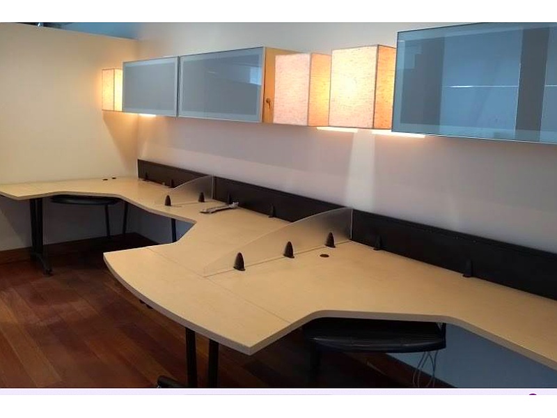 Los escritorios de la imagen presentan un diseño moderno y funcional, ideal para oficinas que buscan un ambiente de trabajo colaborativo y eficiente. Su forma curva, los materiales de alta calidad y la posibilidad de personalización los convierten en una excelente opción para cualquier espacio de trabajo.