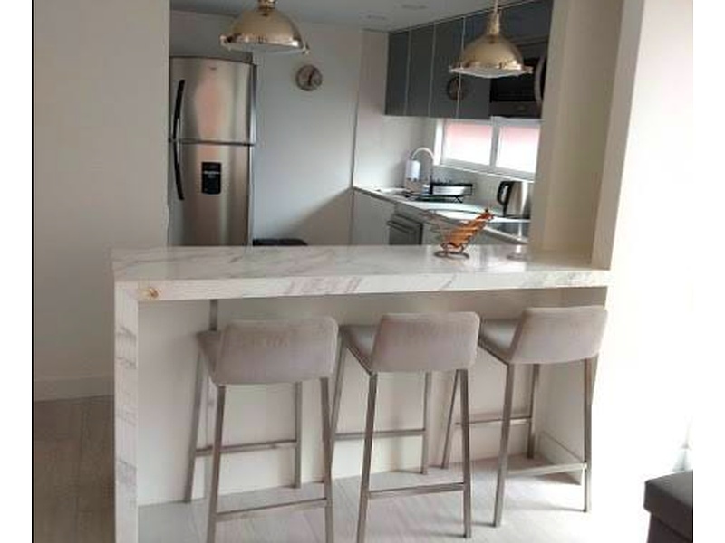 El mesón, junto con las sillas y la iluminación, conforman un espacio con un estilo moderno y elegante. La combinación de materiales y colores crea un ambiente sofisticado y acogedor.