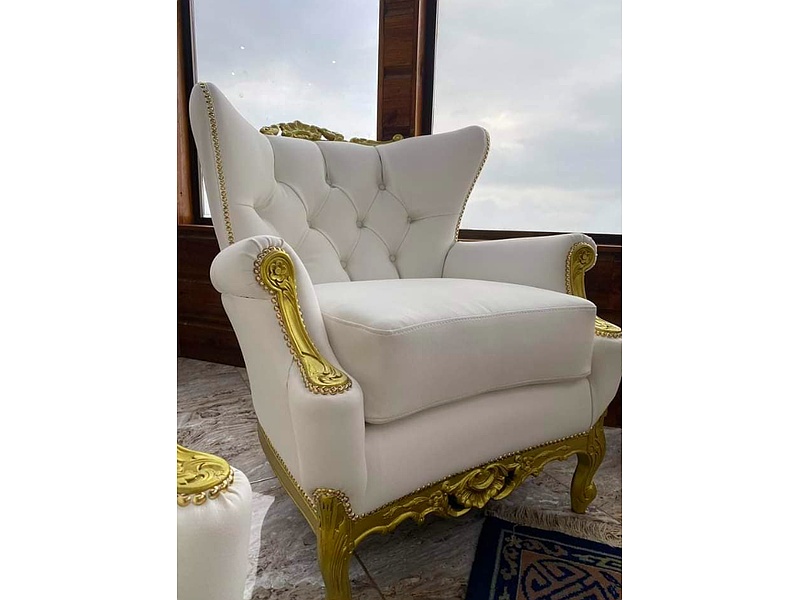 Silla francesa de cuero blanco y dorado.