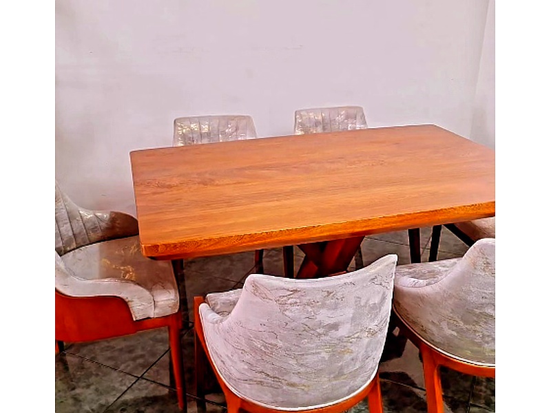 Mesa comedor para 6 personas de color amaderado con sillas acolchonadas y recubiertas de terciopelo