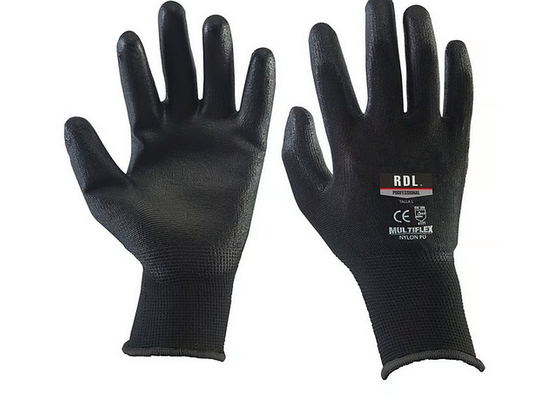 Guante 100% Nylon flexible recubrimiento en poliuretano negro,alta destresza fina,uso en mantenimeinto e inspeccion de mercancia.