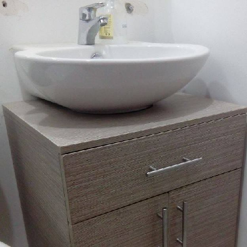 Mueble para lavamanos, elaborado en madera con cajonera y con dos puertas para almacenamiento