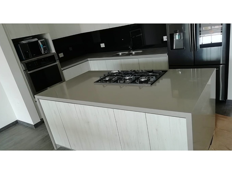 El mesón de la foto es una superficie de cocina elegante y práctica. Su color neutro y su acabado brillante la convierten en una excelente opción para crear un ambiente de cocina limpio y moderno.