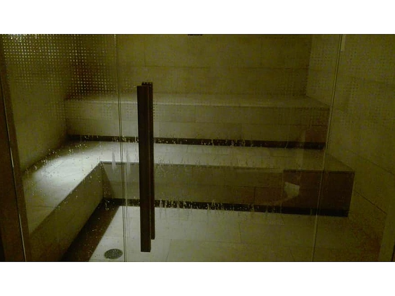 El baño turco en la imagen es un espacio moderno y elegante diseñado para ofrecer una experiencia de relajación auténtica. Su diseño minimalista y el uso de materiales como mármol y granito de alta calidad contribuyen a crear un ambiente sereno y sofisticado.