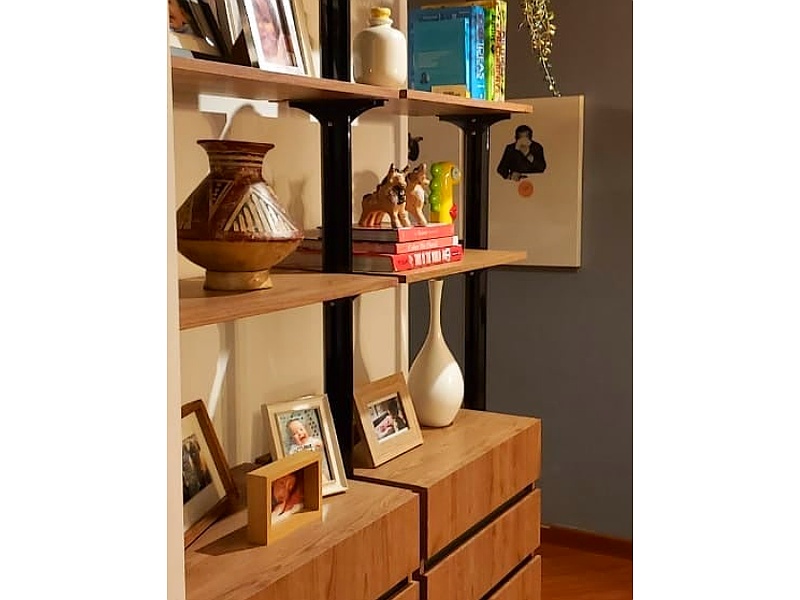 Mueble estantería con cajones y repisas.