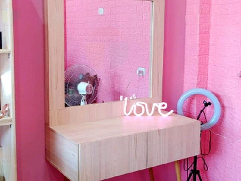 Mueble de tocador con espejo y cajones, diseñado para organizar productos de belleza y accesorios personales.