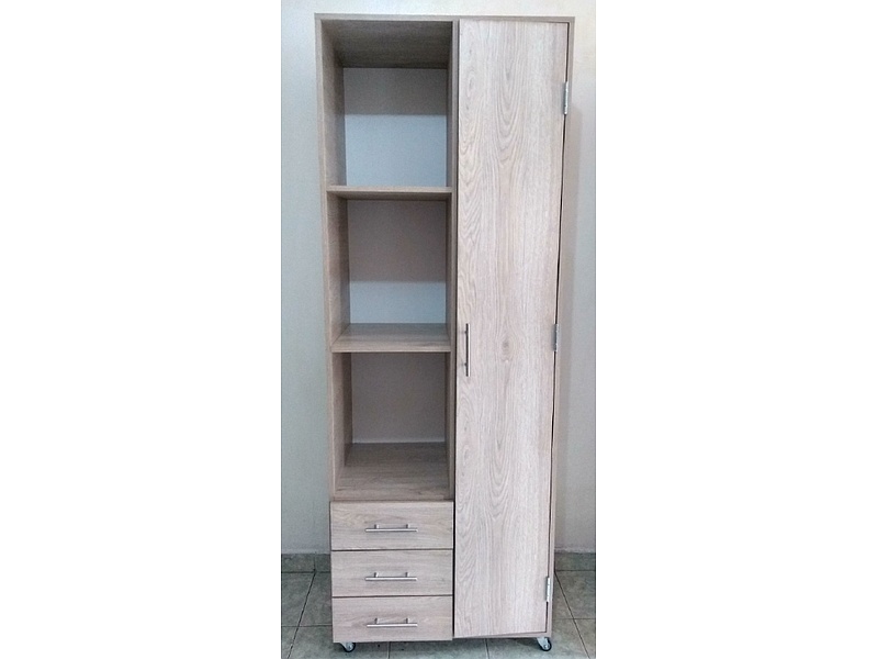 Closet modular con ruedas con tres cajones y una puerta de almacenamiento.