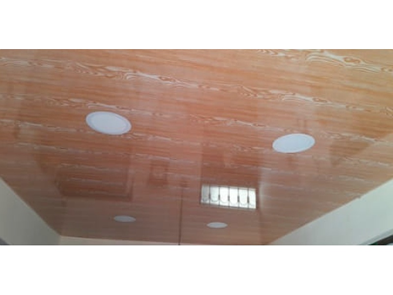 Material: El techo esta hecho de un material plástico o PVC, con un acabado que imita la veta de la madera. Este tipo de material es comúnmente utilizado en techos falsos debido a su resistencia a la humedad, facilidad de limpieza y bajo costo.