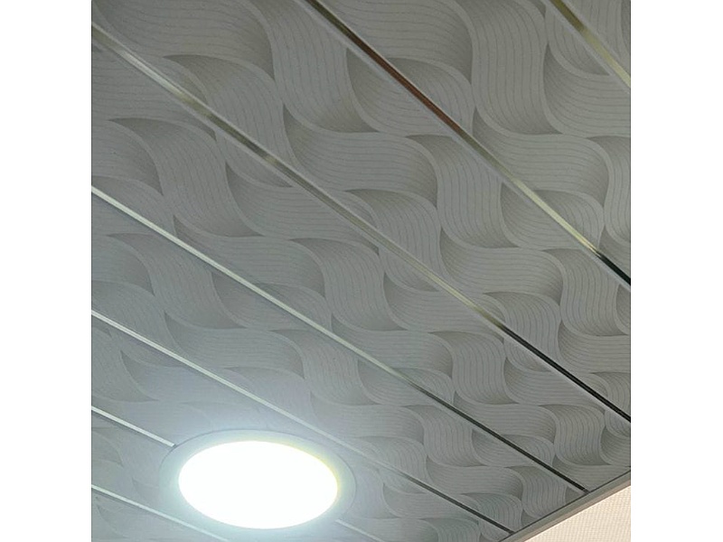 Color: El color base de los paneles es un blanco brillante, pero presentan un diseño impreso en relieve que simula ondas o curvas. Estas ondas tienen un ligero brillo metálico, posiblemente plateado o cromado.