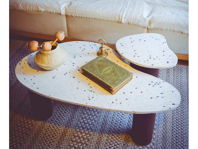 superficie en plastico 100% reciclado y patas en cilindros metálicos color