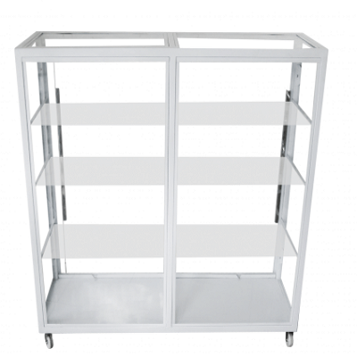 La vitrina doble de vidrio presenta dos secciones o compartimentos de exhibición, permitiendo organizar y mostrar una mayor cantidad de objetos en un solo mueble. Su diseño transparente ofrece una visión clara y elegante, ideal para resaltar colecciones o artículos decorativos.
