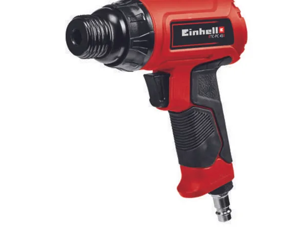 Potente cinceladora para trabajar en piedra y metal. Empuñadura de goma antideslizante que permite trabajar con seguridad. Mejor rendimiento con una manguera de 9 mm de diámetro interior. La toma hexagonal garantiza una guía segura para el cincel. Incluye un juego de cinceles de 120 mm de 4 piezas para numerosas aplicaciones. Incluye 1 botella de aceite, 1 boquilla y 1 muelle tensor. Se suministra en un práctico estuche de transporte y almacenamiento. Max. presión de funcionamiento: 6,3 bar Potencia de aire : 113 L / min. Velocidad de soplado: 4500 rpm Carrera: 43 mm.