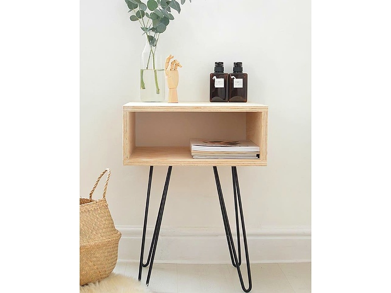 Mesita de noche abierta con cuatro patas metalicas.