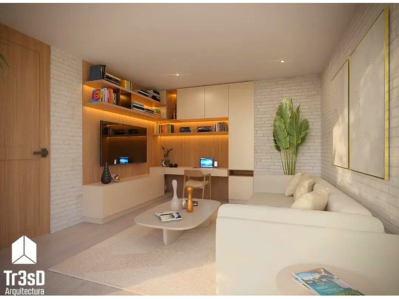 Diseño arquitectónico de sala: Diseño mobiliario personalizado, acabados.