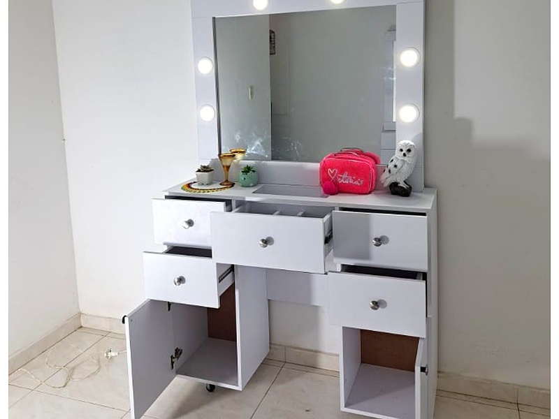 Este tocador combina elegancia y funcionalidad en un diseño compacto, ideal para cualquier dormitorio. Fabricado con materiales de alta calidad, incluye un espejo amplio y múltiples cajones para almacenar tus productos de belleza.