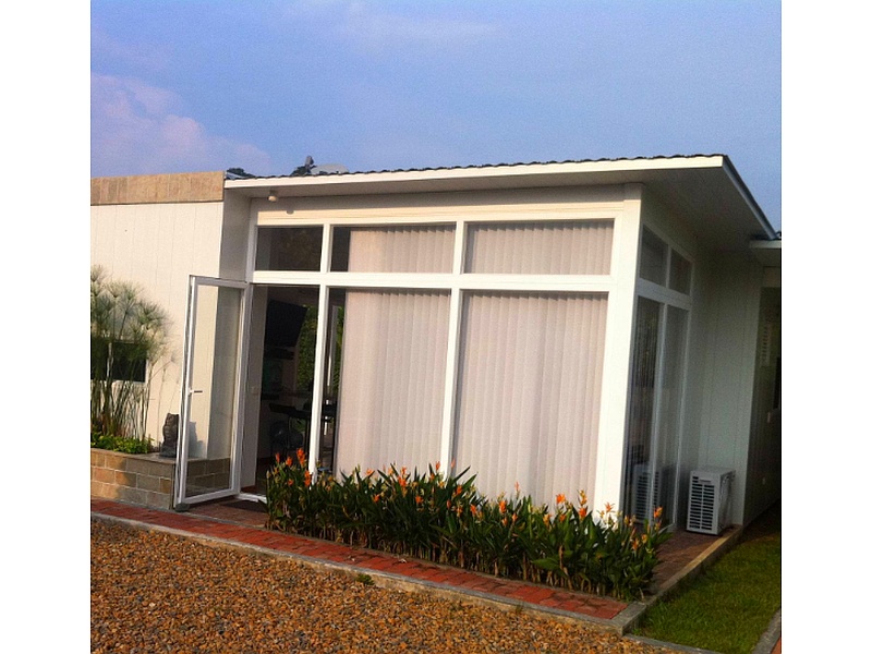 Puerta corrediza de aluminio y vidrio con persianas integradas, ideal para espacios que requieren una combinación de luz natural, privacidad y control de la temperatura. Su diseño moderno y funcional la hace adecuada para una variedad de estilos arquitectónicos.