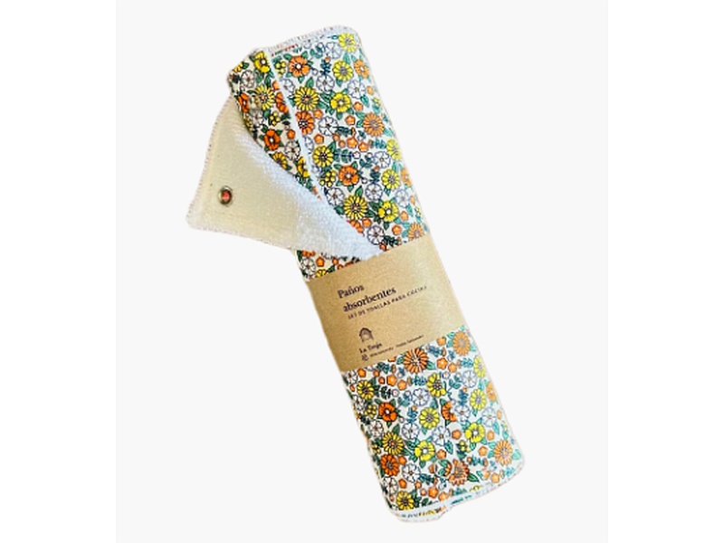 Set de 6 toallas reutilizables de cocina doble cara, por un lado son de tela absorbente en algodón 100% y por el otro son de tela absorbente oscura para limpiar superficies sucias. Hecho en Bogotá.