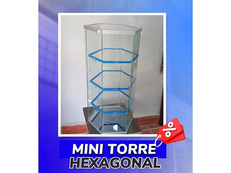Vitrina Mini Torre con forma hexagonal para exhibición de productos.