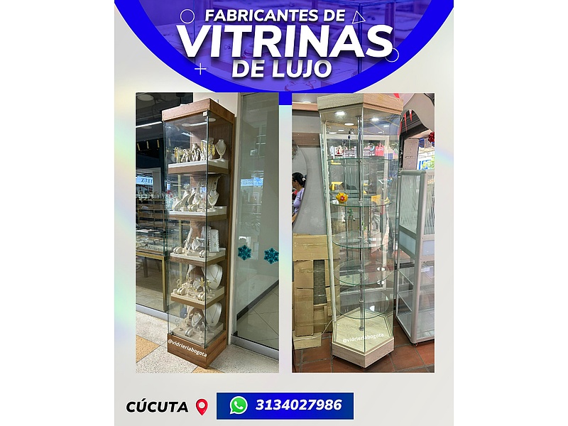 Vitrinas de vidrio de lujo para comercios, exhibidor de productos.