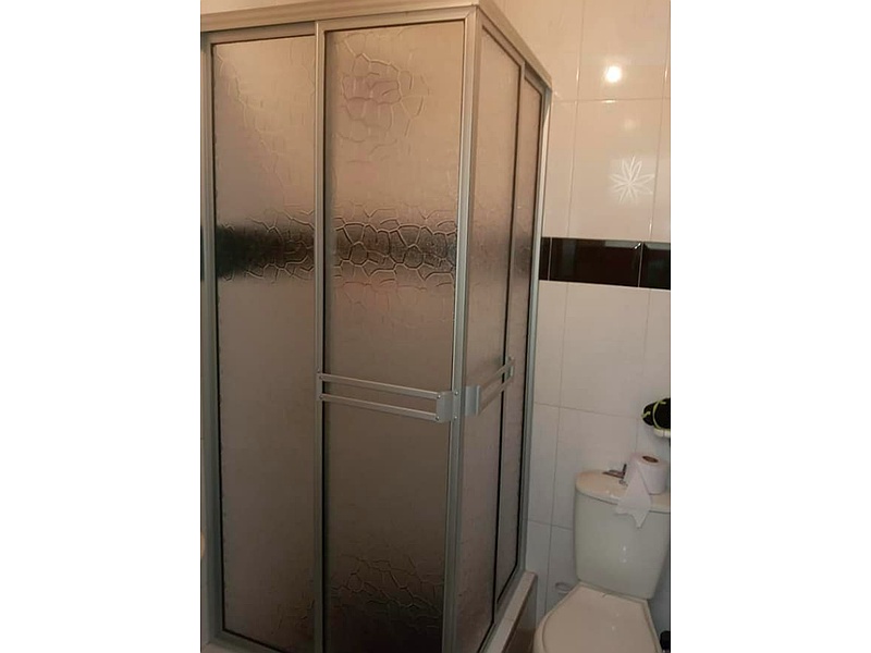 Mampara de baño con bordes de aluminio y vidrios escarchado claro.