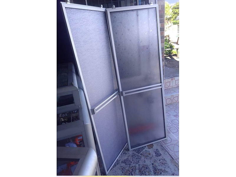 Puertas de mampara con vidrio y aluminio para baños. Con vidrio escarchado.