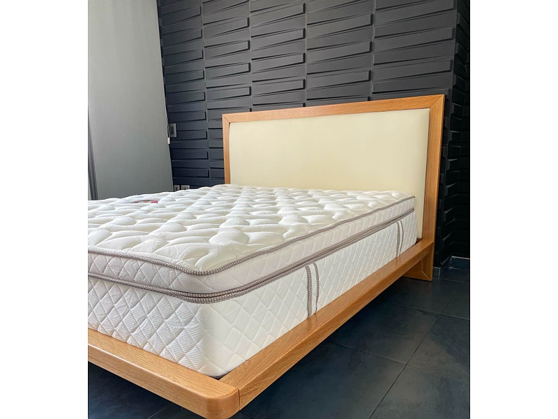 Cama Avant. Material madera roble natural, tapizado en prana.