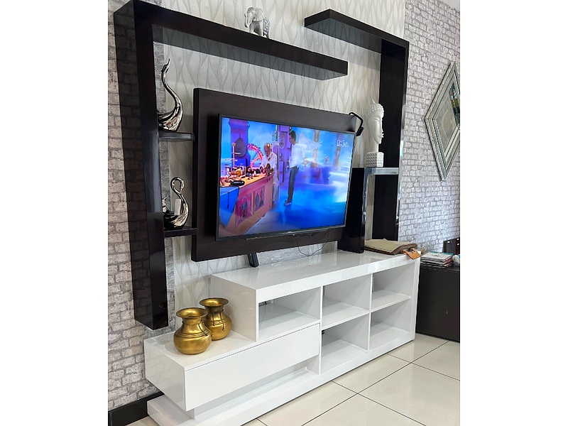Centro de entretenimiento color blanco con varios espacios de almacenamiento.