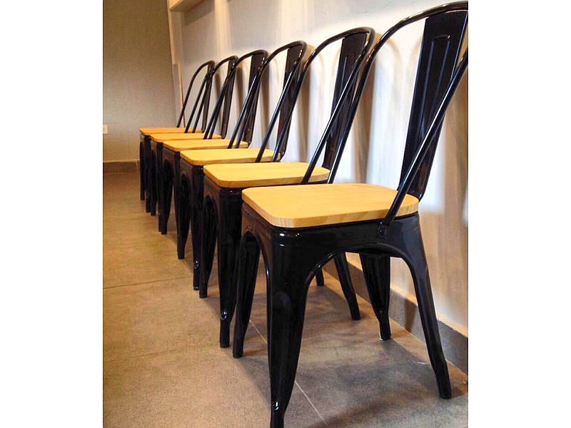 Silla Industrial de negro mate con asiento de madera.