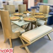 Un comedor de vidrio elegante ofrece un diseño moderno y sofisticado, destacando por su superficie de vidrio que aporta ligereza y luminosidad al espacio. Generalmente incluye una mesa con una superficie de vidrio templado o cristal, combinada con bases de materiales como metal, madera o acrílico con acabados refinados. Las sillas suelen ser complementos en tonos neutros o con detalles decorativos que realzan la elegancia del conjunto.