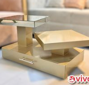 Una mesa de centro dorada para la sala es una pieza llamativa y elegante que aporta un toque de lujo y sofisticación al espacio. Generalmente, la mesa presenta una estructura en metal dorado con acabados brillantes o mate, y puede estar combinada con una superficie de vidrio, mármol o madera.