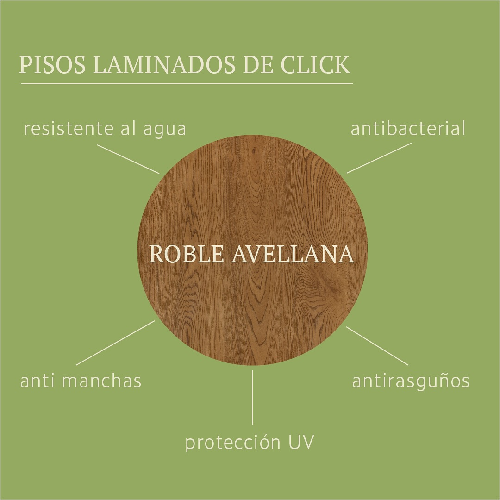 Pisos laminados de click con resistencia al agua, anti rasguños, anti manchas y resistencia a los rayos solares.