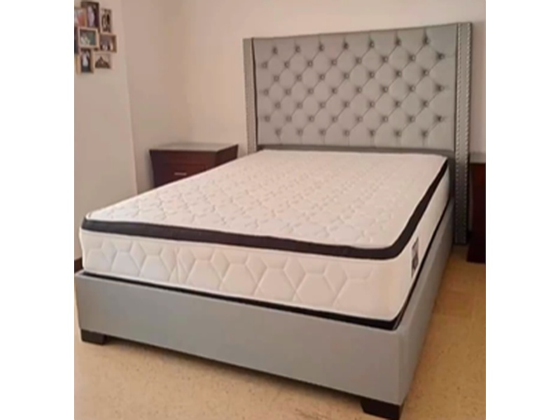 Opción moderna y sofisticada que realza cualquier dormitorio. Su cabecero tapizado, decorado con botones acolchados, aporta un toque de elegancia y confort. El tono gris, versátil y atemporal, se adapta fácilmente a diversos estilos de decoración, creando un ambiente acogedor y contemporáneo.