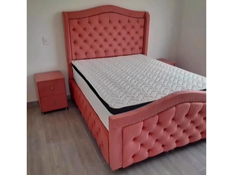 Pieza encantadora y sofisticada que aporta un toque de elegancia a cualquier dormitorio. Su diseño tapizado incluye un cabecero acolchado decorado con botones, que realza su estilo contemporáneo y acogedor. El suave tono rosa no solo añade calidez, sino que también combina fácilmente con diferentes esquemas de decoración.