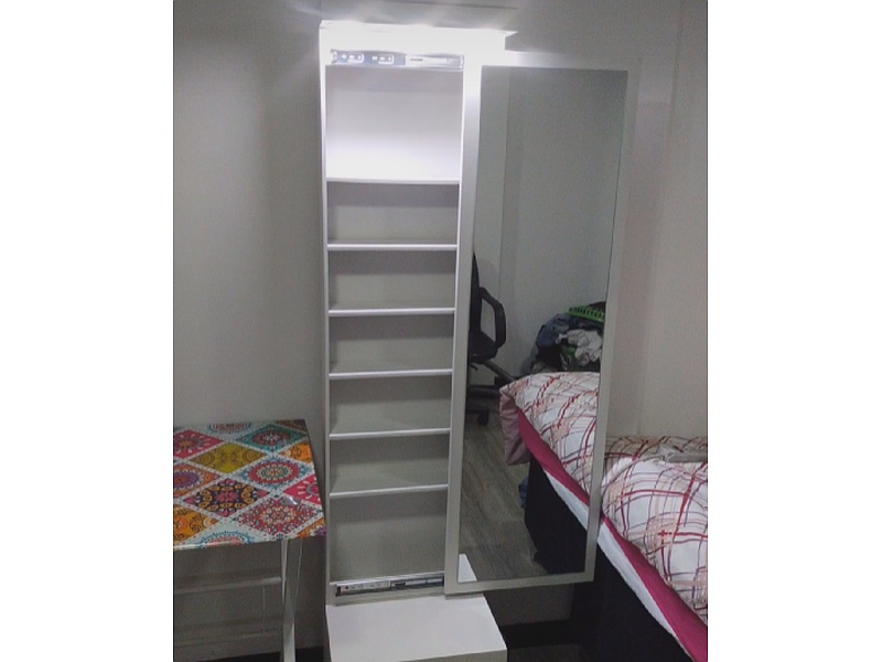 Espejo deslizable con repisas en el interior color blanco.