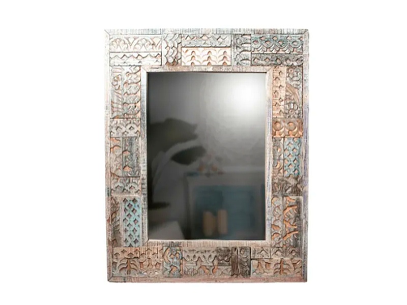 Espejo con marco de madera. El marco esta hecho con pedazos de madera reciclada tallada a mano.
